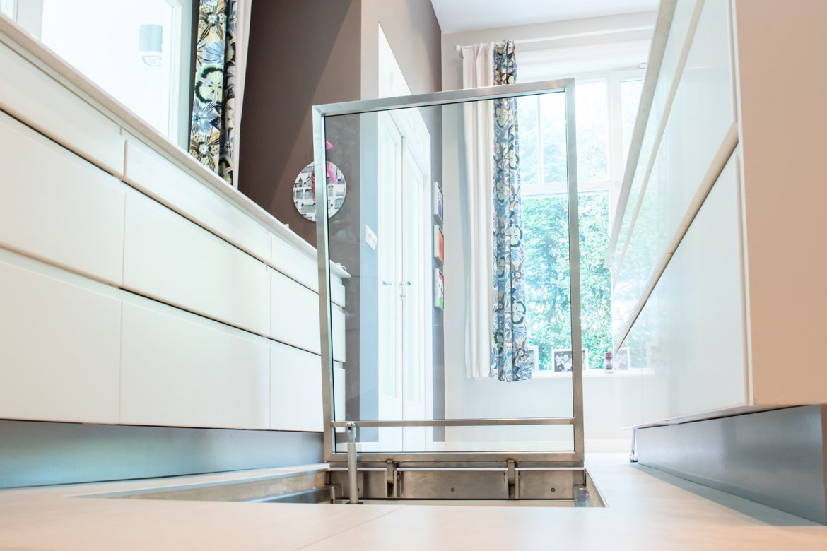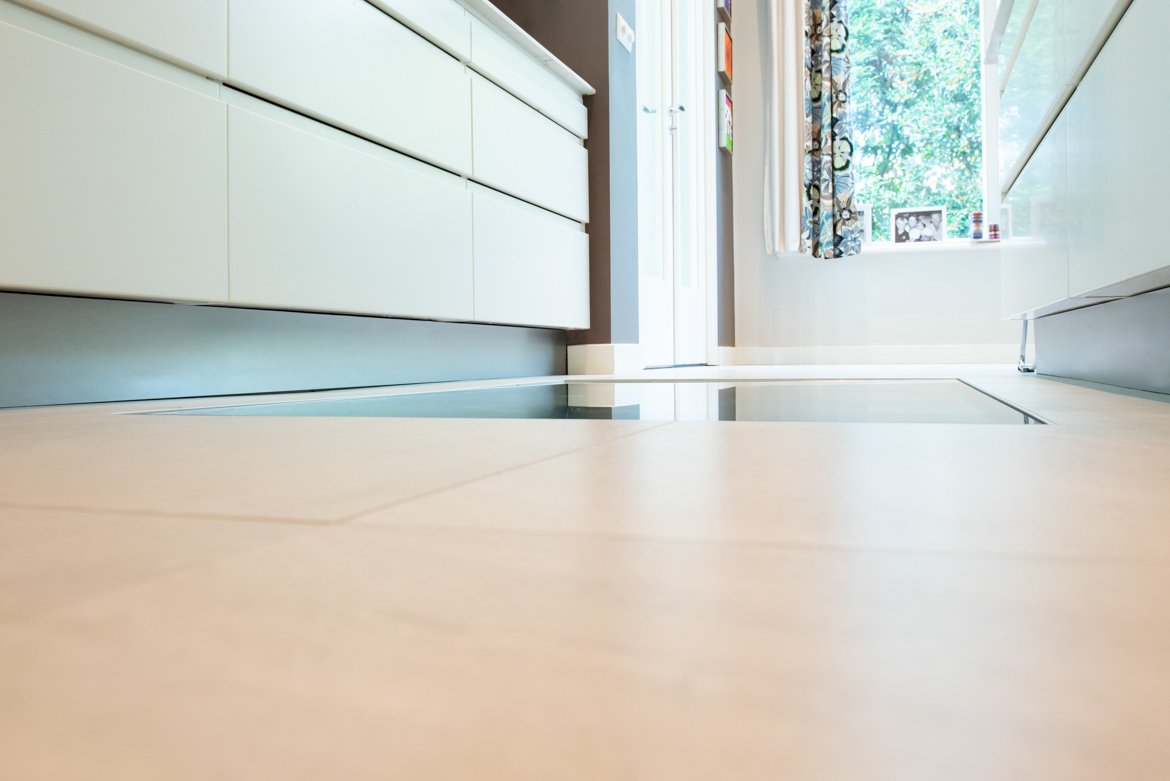Een elektrisch aangedreven glazen vloerluik in de keuken