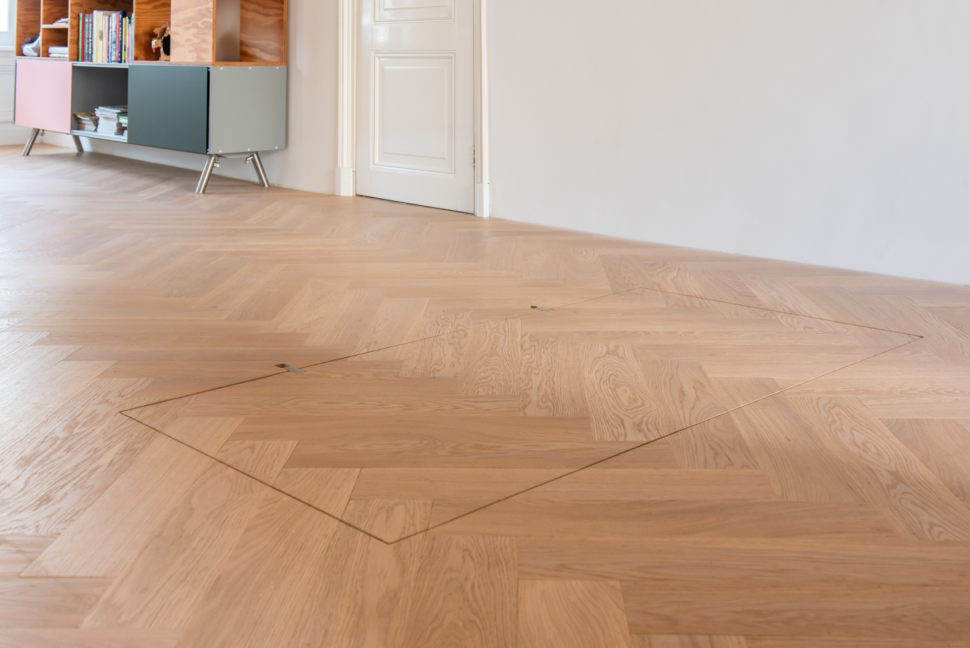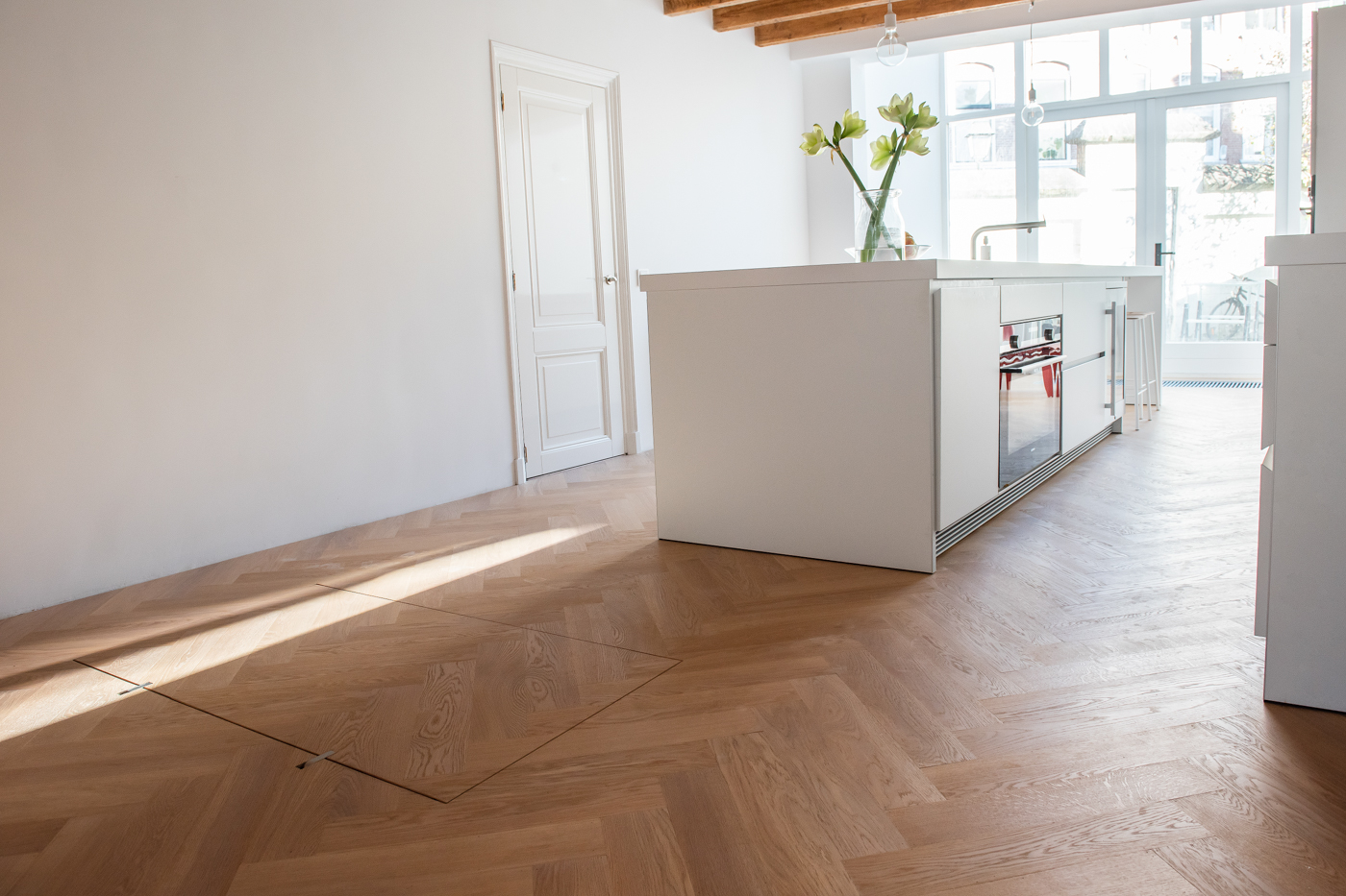 Het verborgen vloerluik is elektrisch te openen en te sluiten. Voor deze techniek hebben we speciaal een geluidsarme motor geselecteerd. De aansturing van het luik kan afhankelijk van de afmetingen zowel aan de korte als de lange kant geplaatst worden. Bedienen kan via een wandschakelaar.