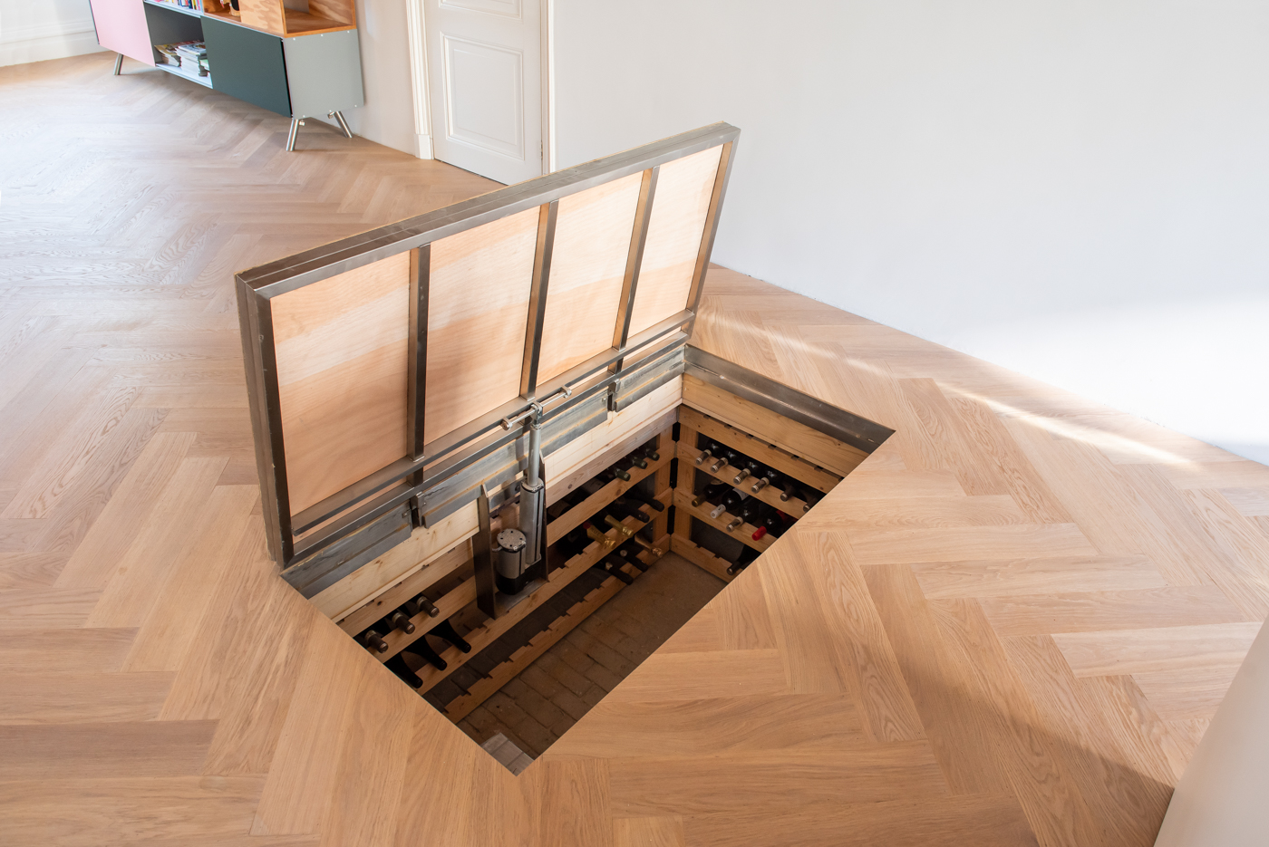 Wij hebben een oplossing ontwikkeld om open kelders op een mooie en veilige manier toegankelijk te maken. Het vloerluik is beloopbaar en geheel verzonken in de vloer, zonder uitstekende delen. Het openen en sluiten kan om veiligheidsredenen alleen via een wandschakelaar. We hebben hierbij bewust voor een lange open- en sluitingstijd gekozen. Wanneer de stroom in uw woning uitvalt, kan het luik uiteraard ook met de hand geopend worden.