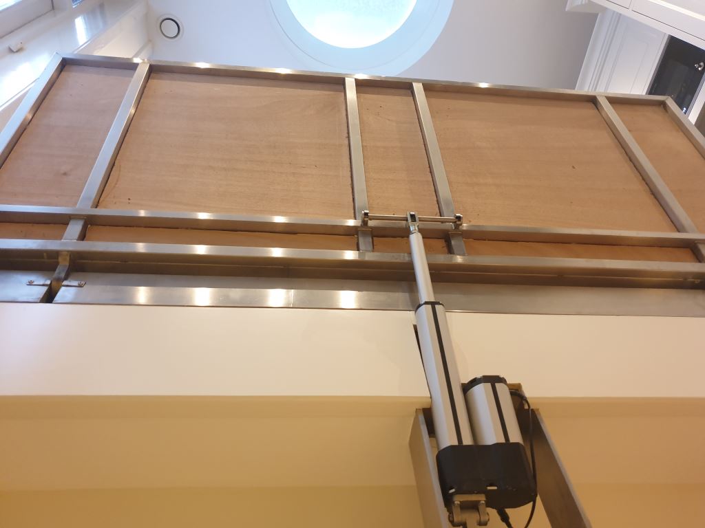 Het verborgen vloerluik is gemakkelijk elektrisch te openen en te sluiten. Voor deze techniek hebben we speciaal een geluidsarme motor geselecteerd. Deze motor kan afhankelijk van de afmetingen zowel aan de korte als de lange kant van het luik geplaatst worden. Bedienen kan via een wandschakelaar of afstandbediening.